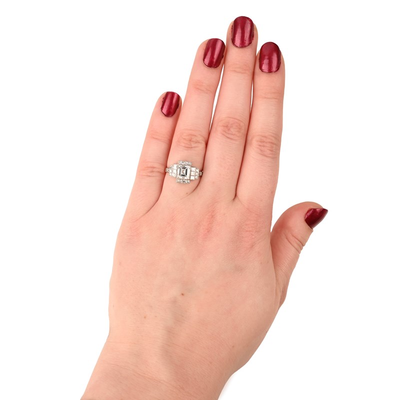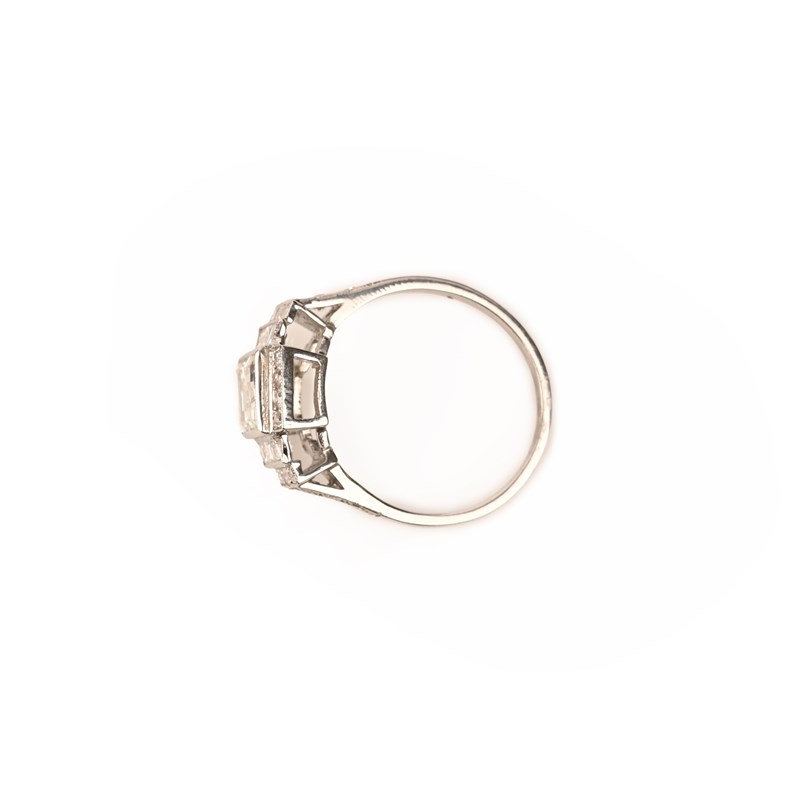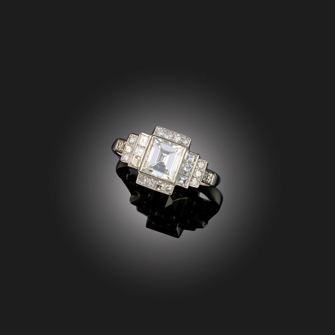 A DIAMOND CLUSTER RING, set to the centre with a step-cut diamond weighing approximately 0.85cts, within geometric borders set with calibré-cut and circular-cut diamonds, in platinum, indistinctly stamped PLAT, size L 1/2