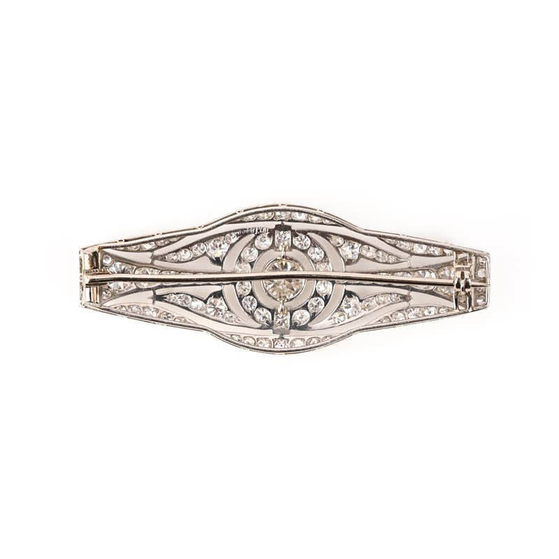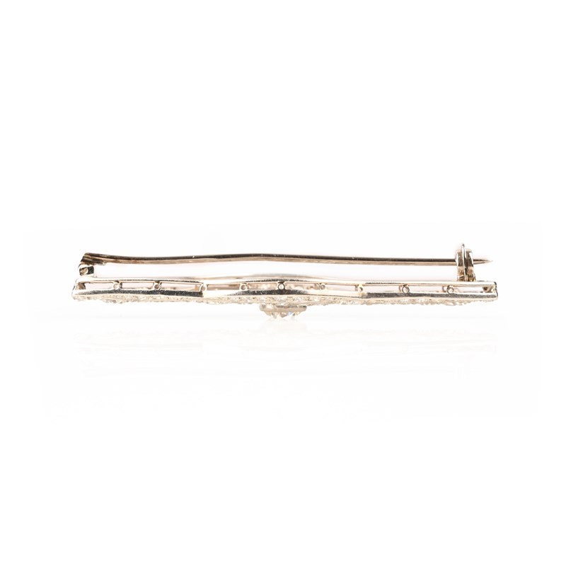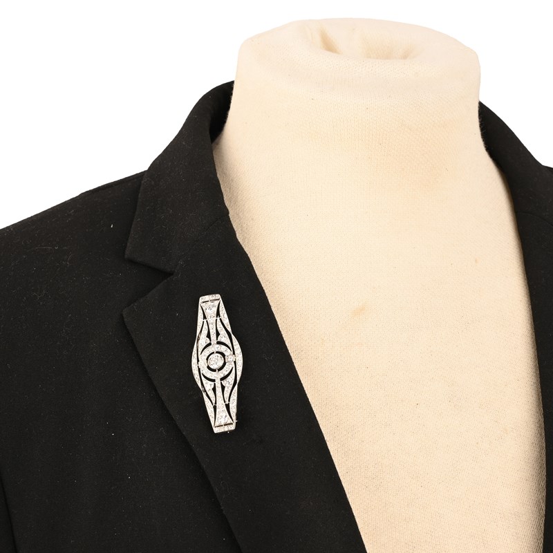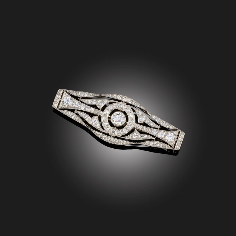 AN ART DECO DIAMOND BROOCH, of tapering lozenge shape, pierced and millegrain-set with graduated old circular-cut diamonds in platinum, length 5.5cm