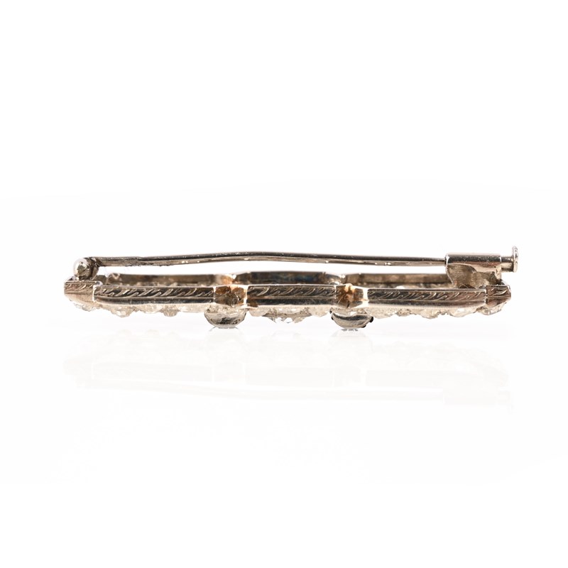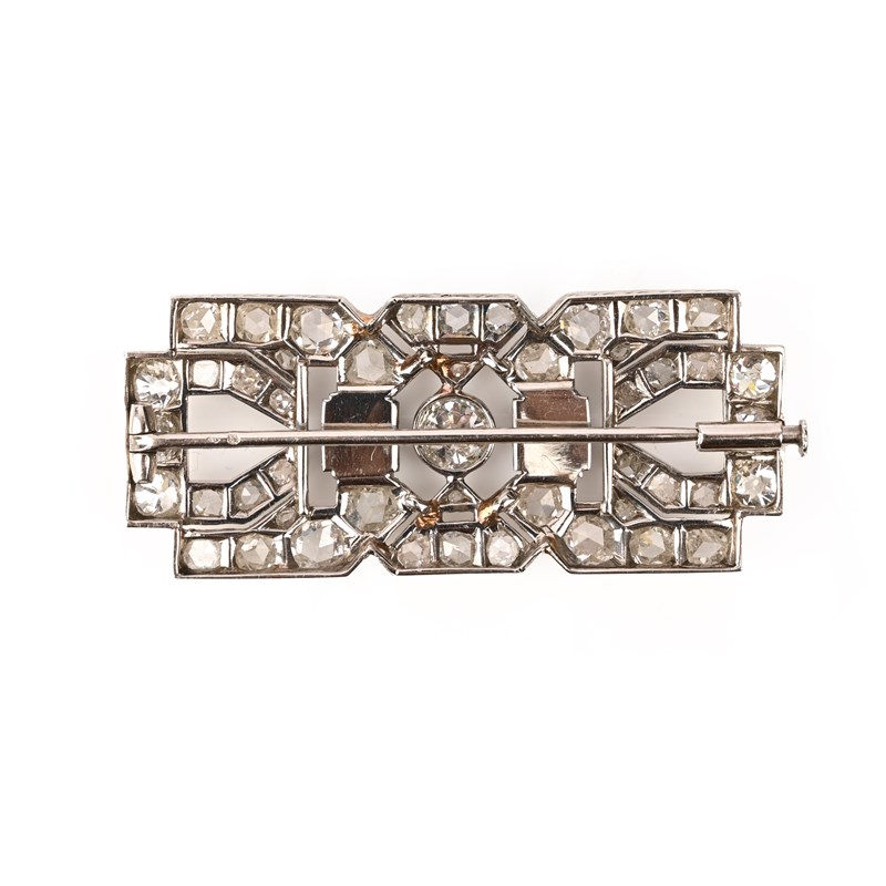 A FRENCH ART DECO ONYX AND DIAMOND BROOCH, of geometric design set with graduated rose-cut diamonds and a central old circular-cut diamond with fluted onyx accents in platinum and white gold, French control mark and partial maker's lozenge, length 5.2cm
