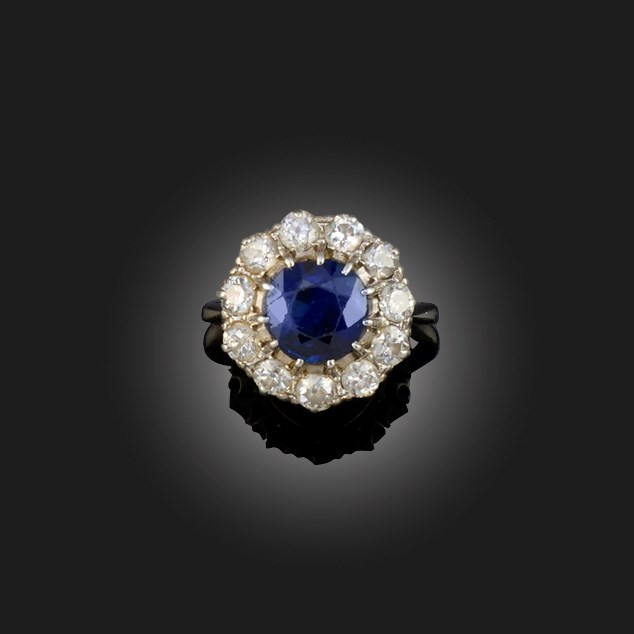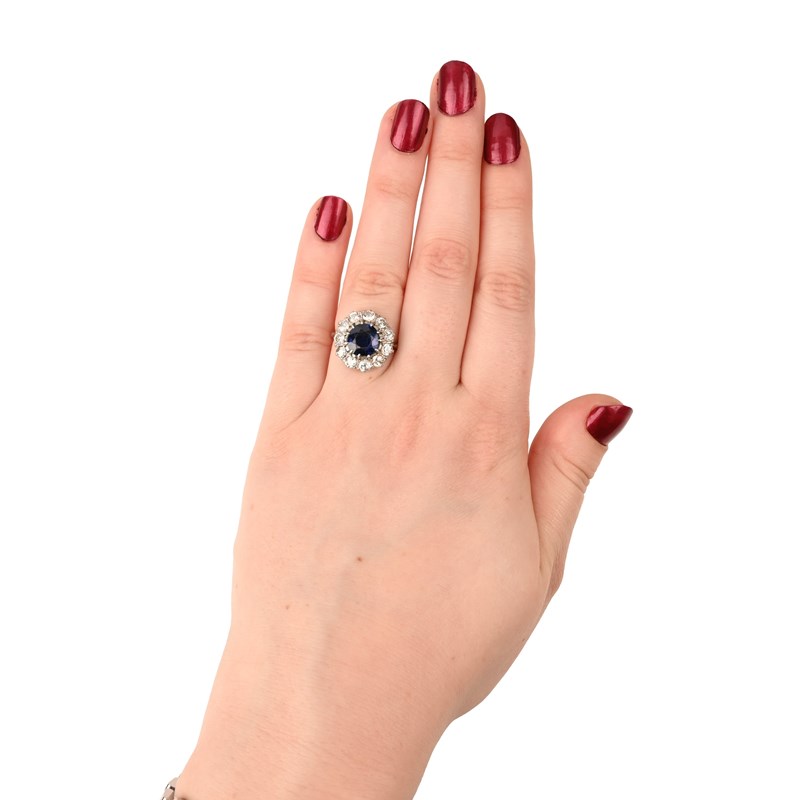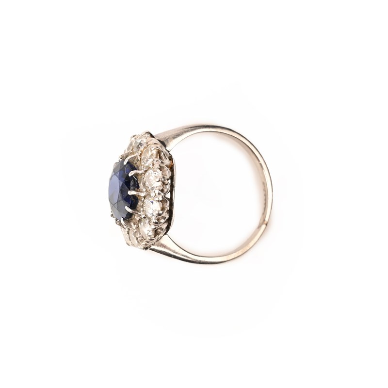A SAPPHIRE AND DIAMOND CLUSTER RING