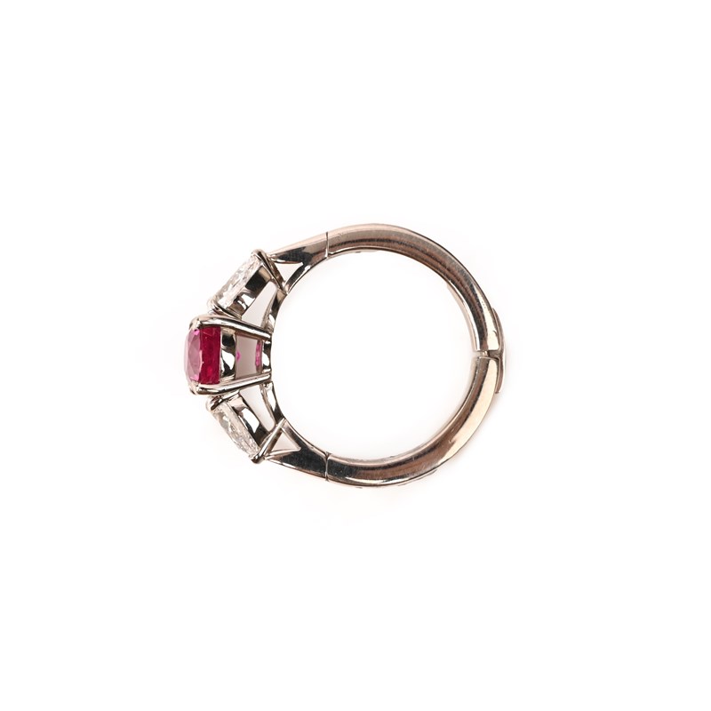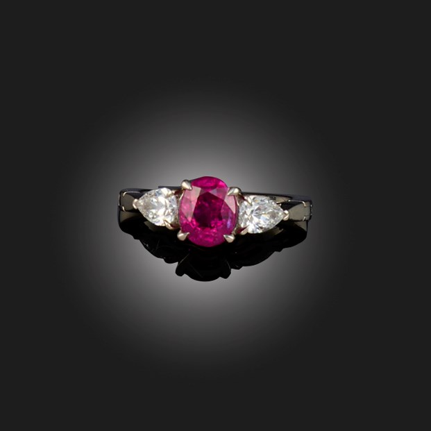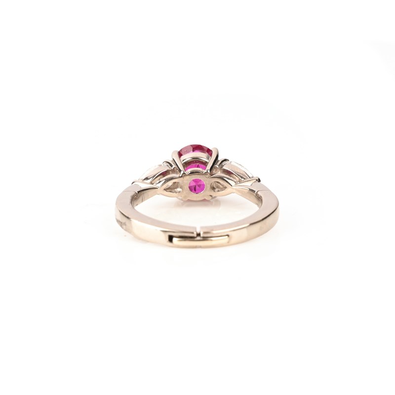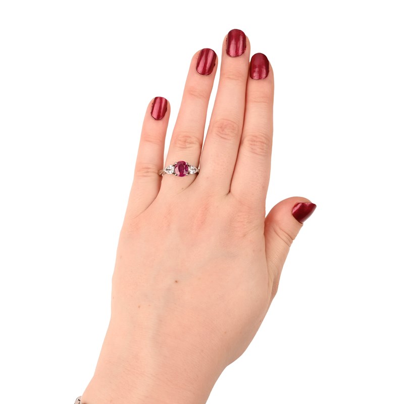 A RUBY AND DIAMOND THREE STONE RING, C2018, set with an oval-shaped ruby weighing 2.01cts, flanked with pear-shaped diamonds in expanding white gold shank, London hallmarks for 2018, size N