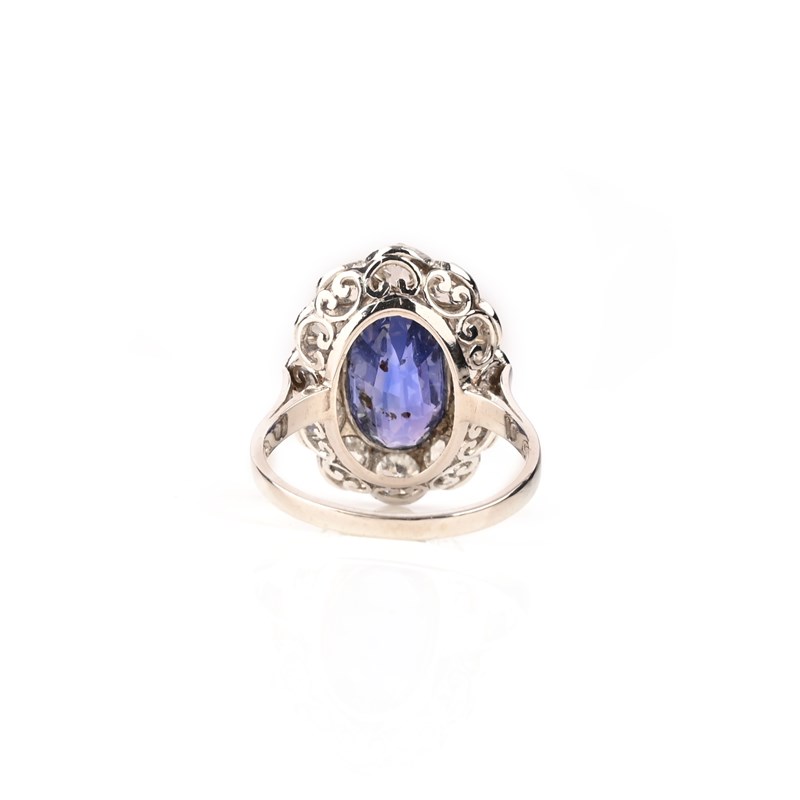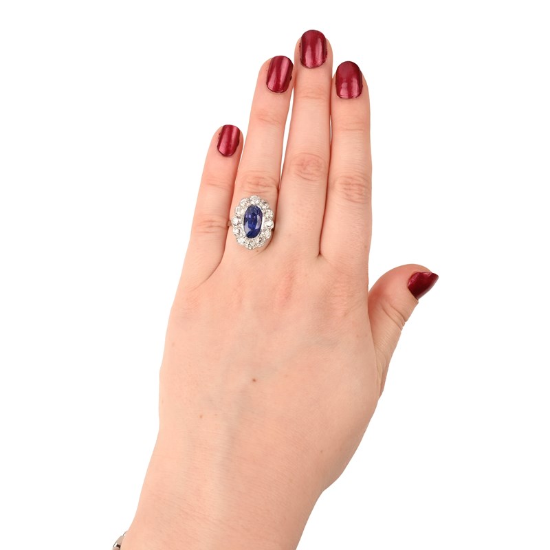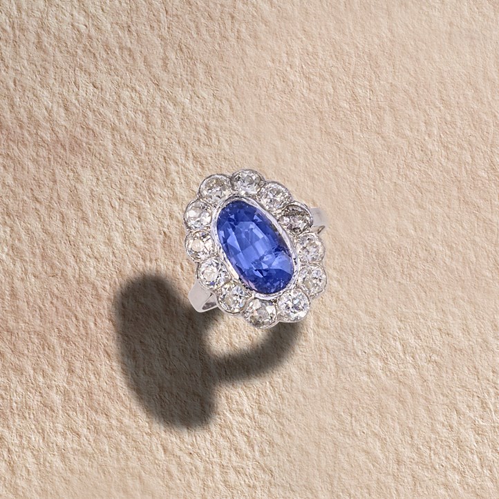 A SAPPHIRE AND DIAMOND CLUSTER RING