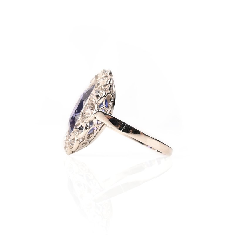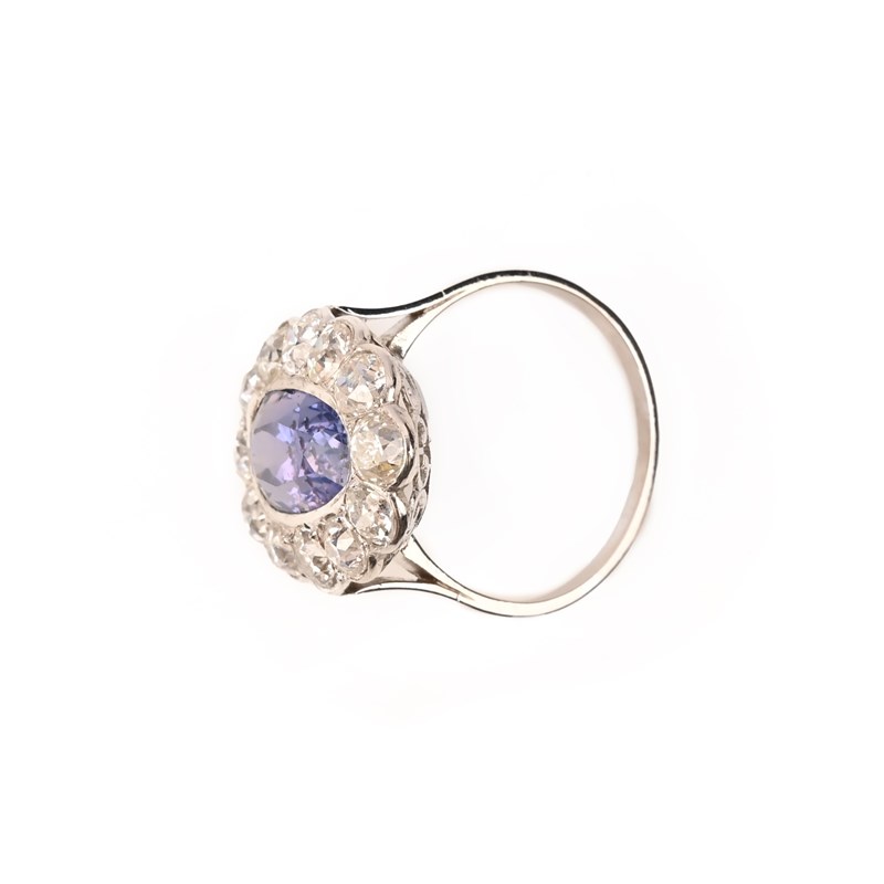 A SAPPHIRE AND DIAMOND CLUSTER RING, set with an oval colour change sapphire weighing approximately 4.00cts within a surround of old circular-cut diamonds in white gold, size L 1/2