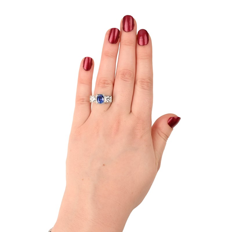A SAPPHIRE AND DIAMOND THREE STONE RING