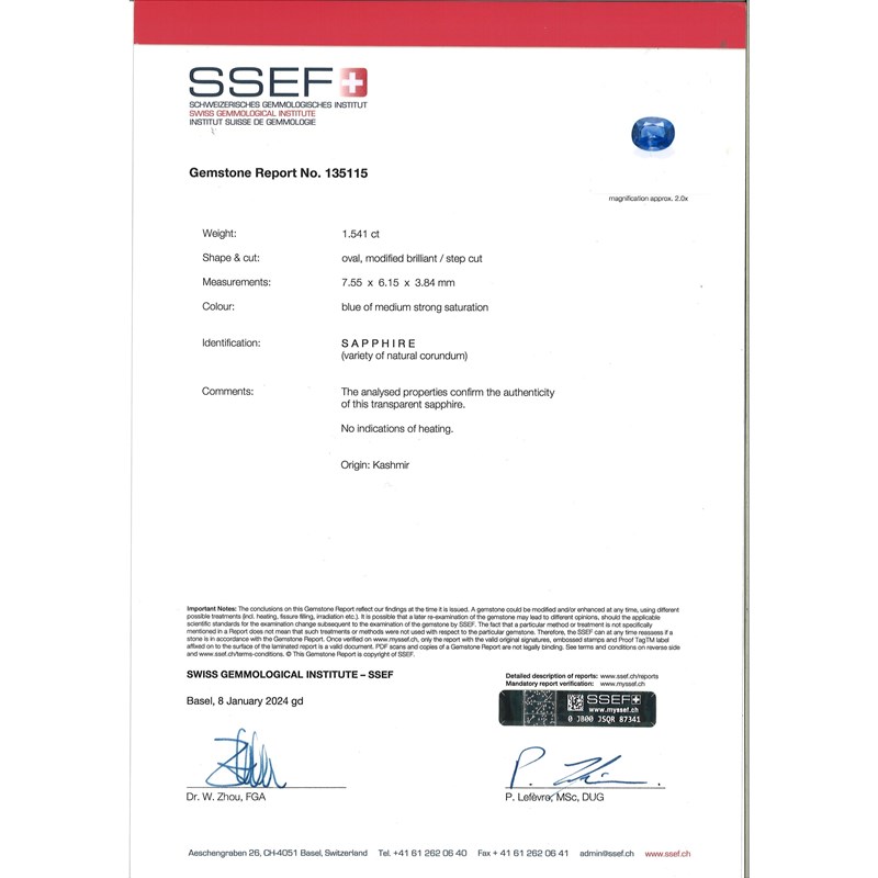 Accompanied by report number 135115 dated 8th January 2024 from SSEF stating that the blue oval, modified brilliant / step cut sapphire weighs 1.541cts, is of medium strong saturation and shows no indication of heating, origin: Kashmir