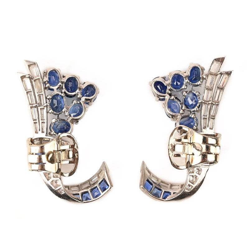 LUCIEN GIRARD FOR LACLOCHE FRÈRES, A PAIR OF SAPPHIRE AND DIAMOND EAR CLIPS, C1935, of stylised cornucopia design set with lines of graduated baguette-shaped diamonds and graduated oval-shaped sapphires in a spray design, waisted with a panel of calibré-cut sapphires and further diamonds in platinum and white gold, additional hinged clip fittings allowing the earrings to be worn as a pair of lapel brooches, signed, with maker's mark and French control marks, length 4.4cm