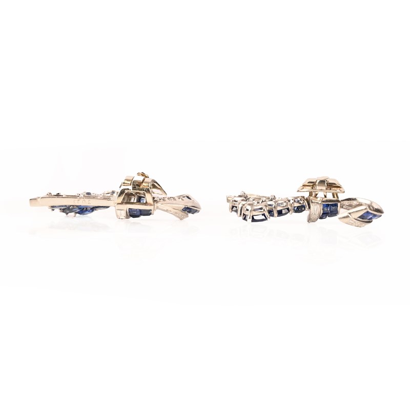 His work reflects the refined geometry and technical precision associated with French Art Deco design, a period during which Paris stood at the forefront of innovation in gemstone cutting and platinum mount construction. The present earrings, set with calibré-cut sapphires arranged in a sculptural curved motif and accented by baguette-cut diamonds, exemplify this aesthetic. The contrast between the richly saturated blue sapphires and the linear diamond elements demonstrates the disciplined symmetry and craftsmanship characteristic of Parisian ateliers in the 1930s.