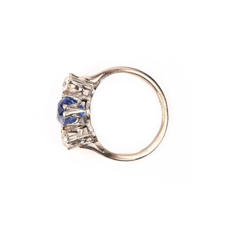 A SAPPHIRE AND DIAMOND RING, set with a cushion-shaped sapphire weighing 3.173cts, flanked with old circular-cut diamonds weighing approximately 0.45cts in total, in white gold setting, stamped 18ct, size L 1/2