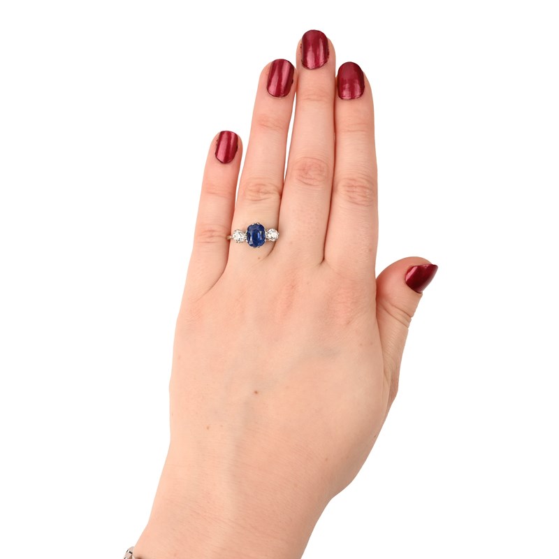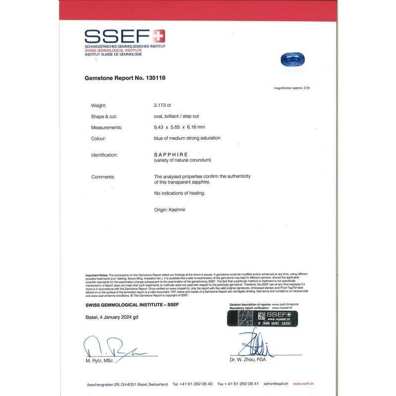 Accompanied by report number 135118 dated 4th January 2024 from SSEF stating that the blue oval brilliant / step cut sapphire weighs 3.173cts, is of medium strong saturation and shows no indication of heating, origin: Kashmir