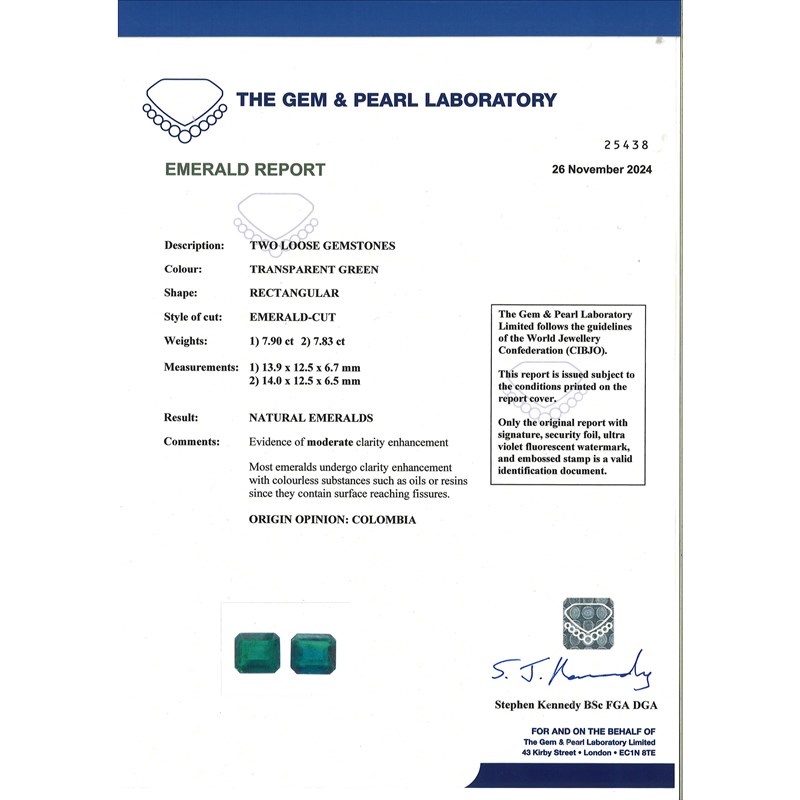 Accompanied by report number 25438 from The Gem and Pearl Laboratory stating that the emeralds are natural with evidence of moderate clarity enhancement, origin: Colombia