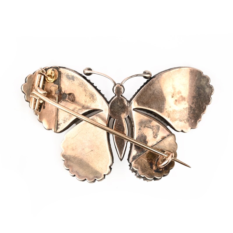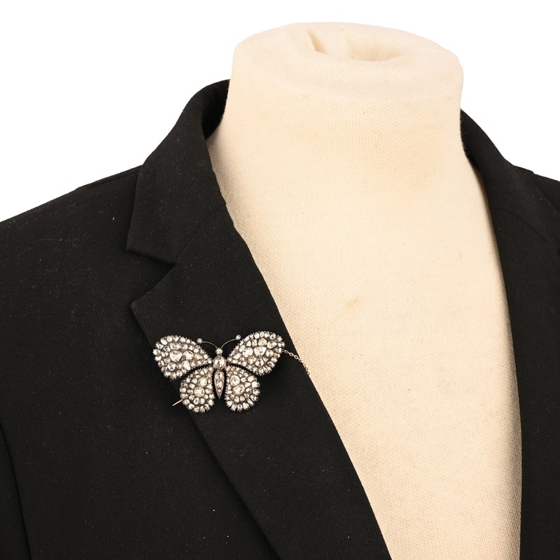A FINE GEORGE III DIAMOND BUTTERFLY BROOCH, pavé-set with graduated rose-cut diamonds in silver and gold closed-back setting, later added brooch pin, length 5.2cm