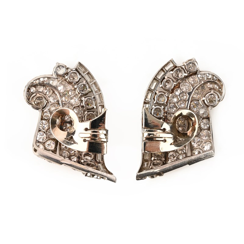 A PAIR OF ART DECO DIAMOND SCROLL EARRINGS, set with graduated old circular-cut diamonds and a border of baguette-shaped diamonds in platinum and white gold, total approximate diamond weight 15.00cts, clip fittings, length 3.9cm