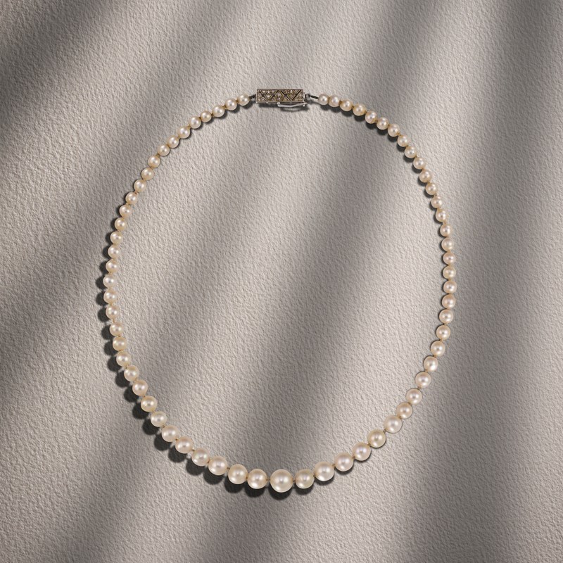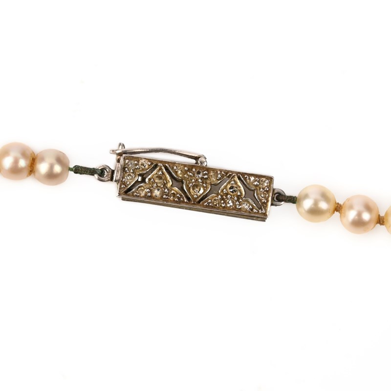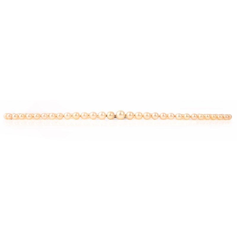 A SINGLE ROW NATURAL PEARL NECKLACE, composed of a graduated natural pearls measuring approximately 4.4-8.5mm, to a diamond-set clasp, in platinum, length 44.5cm