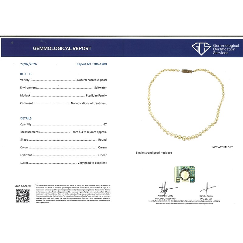 Accompanied by report number 5786-1700 from GCS dated 27th February 2026 stating that the pearls measure approximately 4.4-8.5mm and are natural saltwater