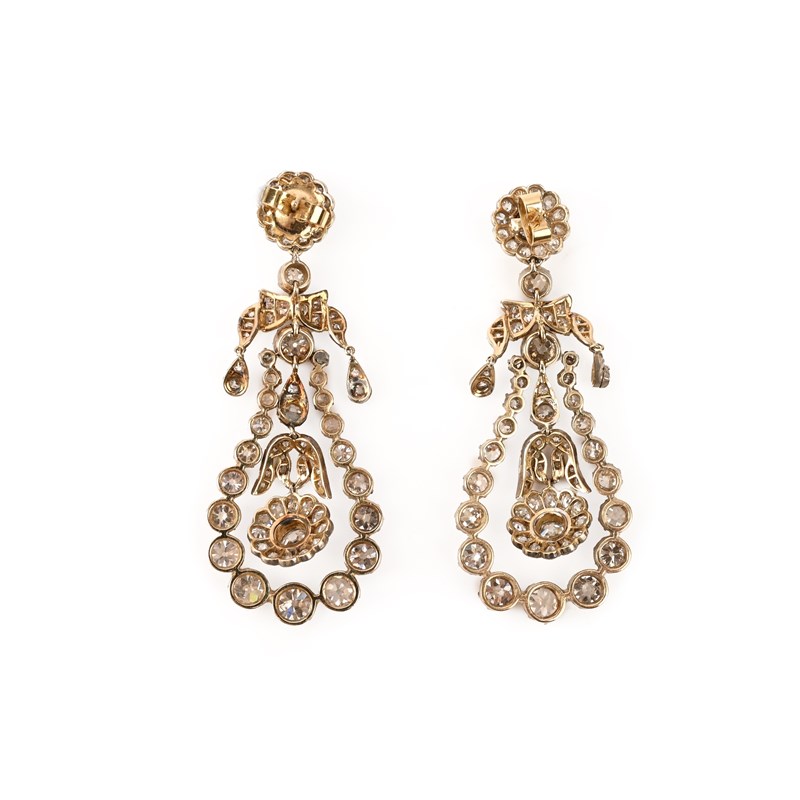 A PAIR OF LATE VICTORIAN DIAMOND-SET DROP EARRINGS, the pear shaped frames suspend cluster and scroll designs from a bow and upper cluster, set overall with graduated cushion-shaped diamonds in articulated silver and gold mounts, later post fittings, length 6.5cm