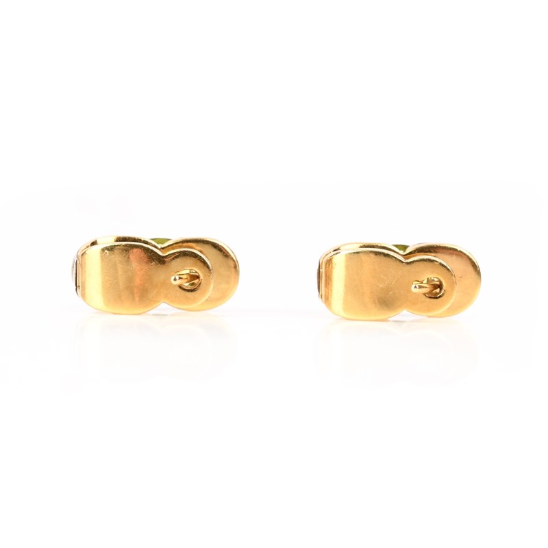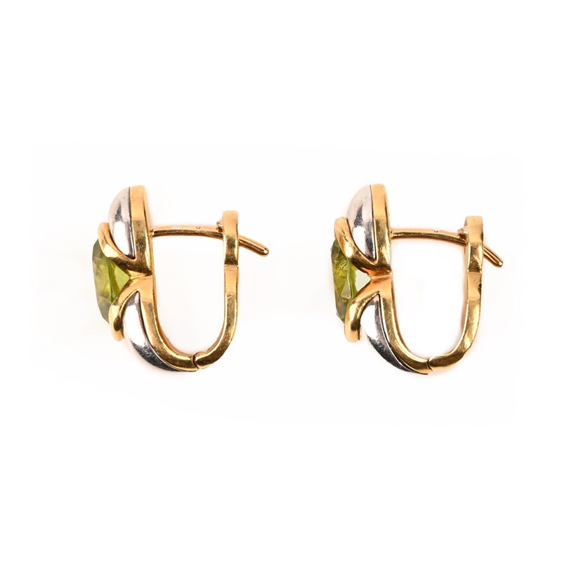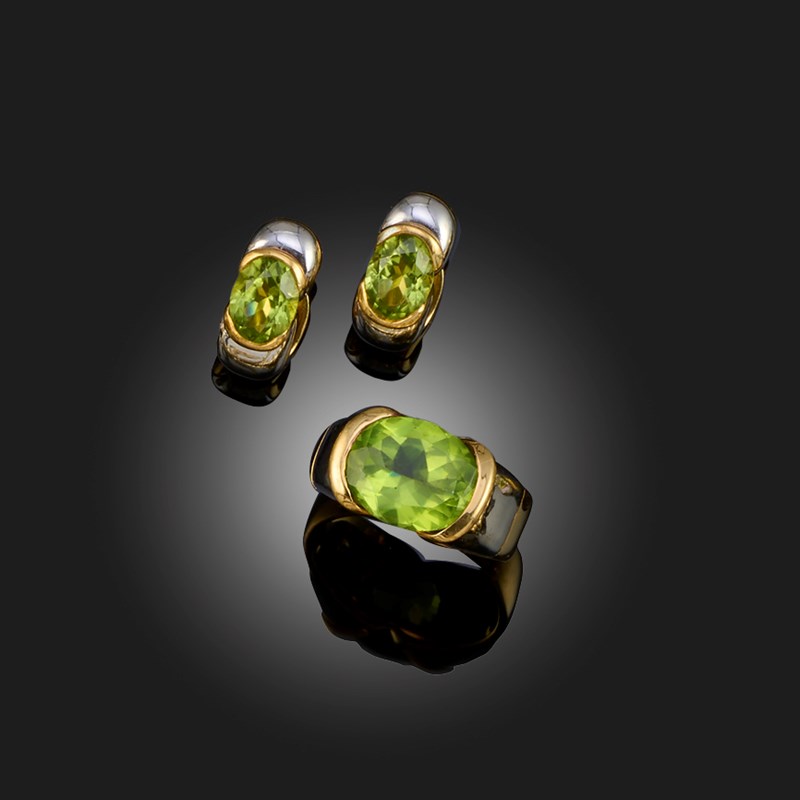 MARINA B, A PERIDOT RING, C1998, WITH SIMILAR EARRINGS, comprising a bi-colour gold ring set with an oval peridot, maker's mark, numbered C1647, London import marks for 1998, size Q, with a similar pair of peridot earrings by Boodle & Dunthorne, C2003, set with oval peridots in bi-colour gold, London hallmarks for 18ct gold, 2003, post and clip fittings, length 1.6cm