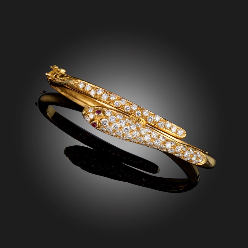 A DIAMOND-SET GOLD SNAKE BANGLE, the stylised serpent with ruby eyes is pavé-set with round brilliant-cut diamonds to the upper half, in yellow gold, inner circumference 17.5cm, 20g
