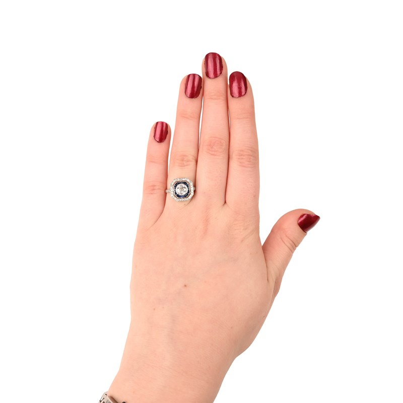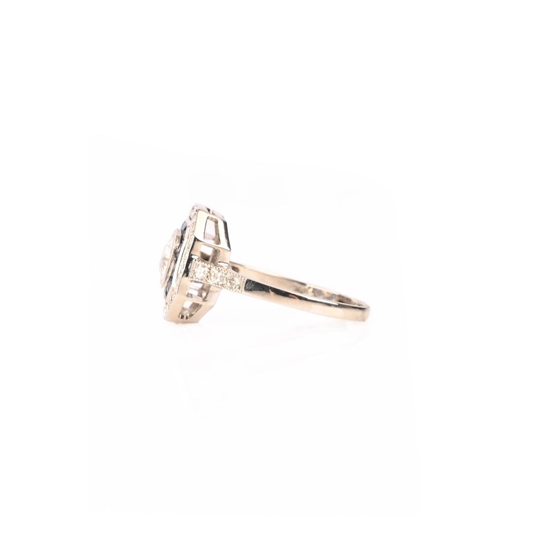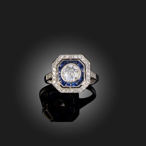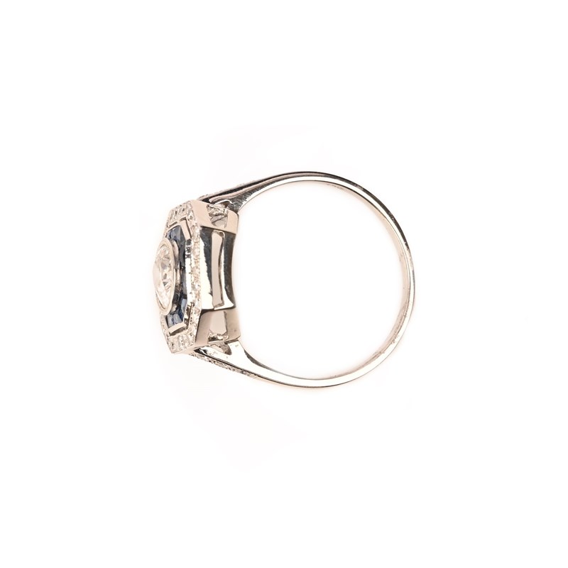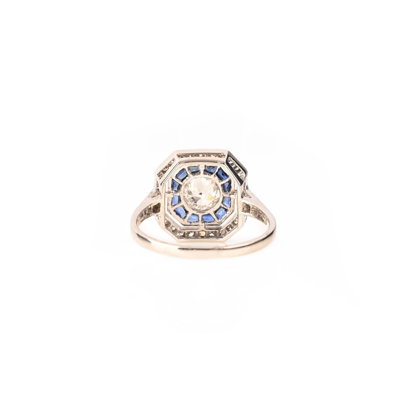 A SAPPHIRE AND DIAMOND RING, set to the centre with a circular-cut diamond weighing approximately 0.60cts, within a border of channel-set French-cut sapphires and a further border of circular-cut diamonds, in white gold, stamped 750, size N 1/2