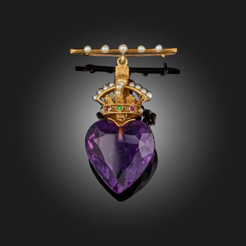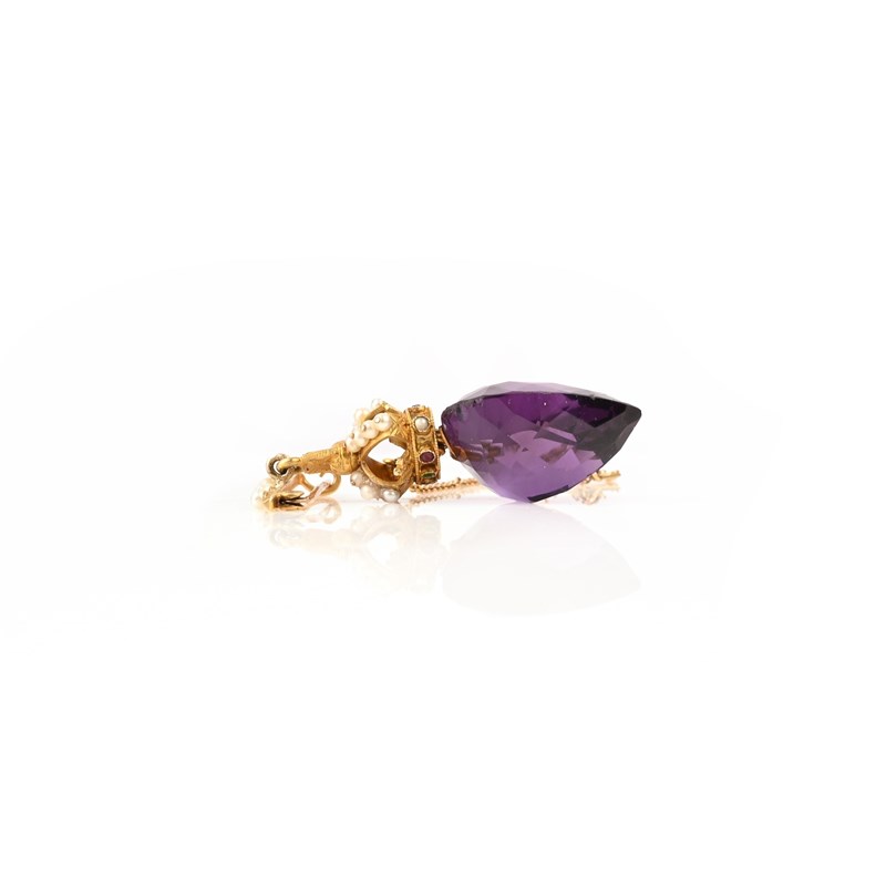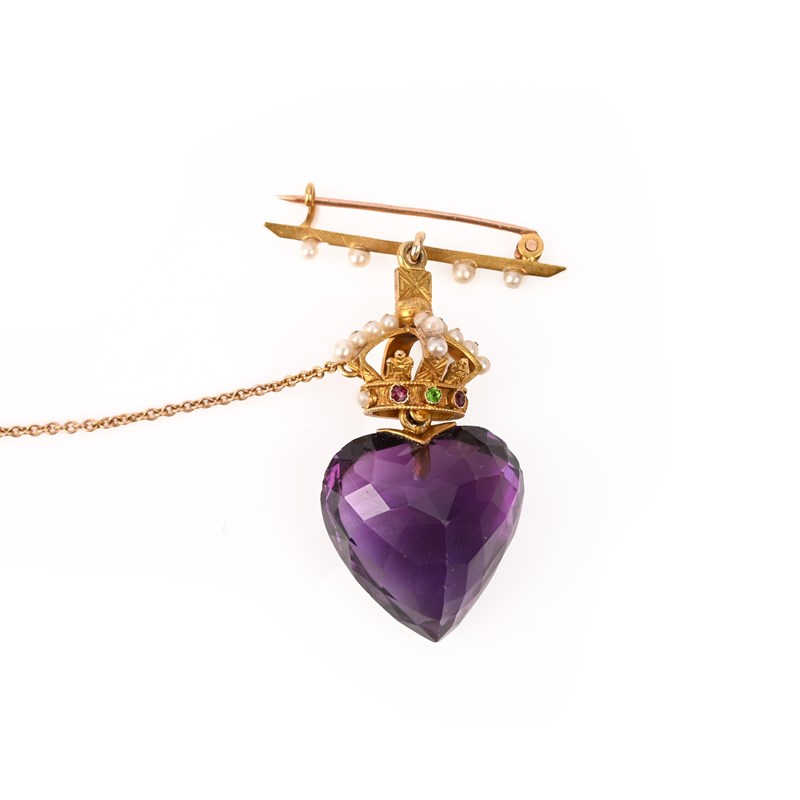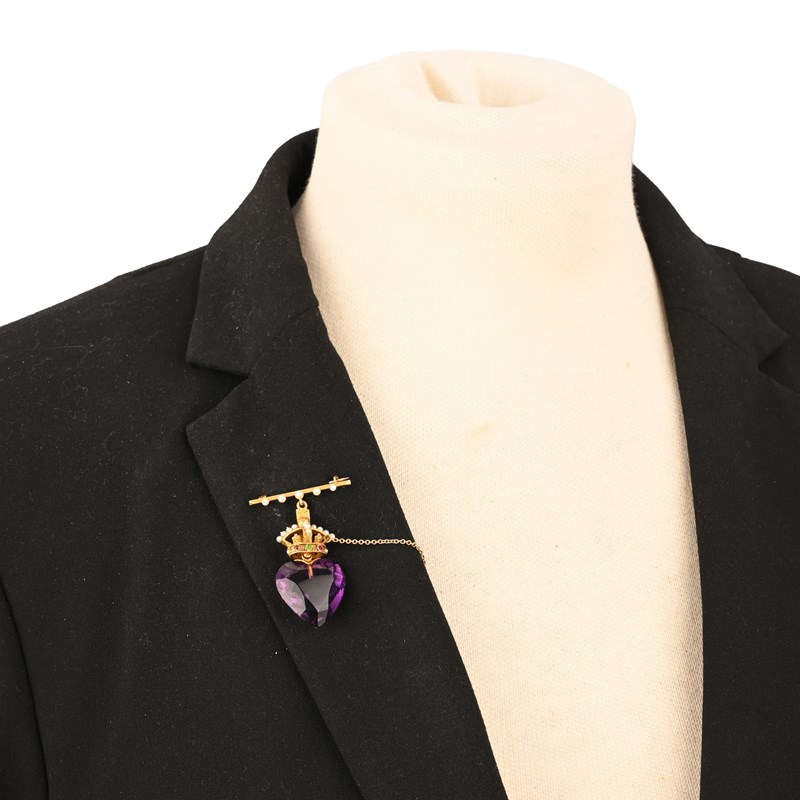 A VICTORIAN AMETHYST AND SEED PEARL BROOCH, the amethyst heart suspended below a gold coronet set with seed pearls, rubies and a demantoid garnet, on a seed pearl-set gold bar brooch, length 4.2cm