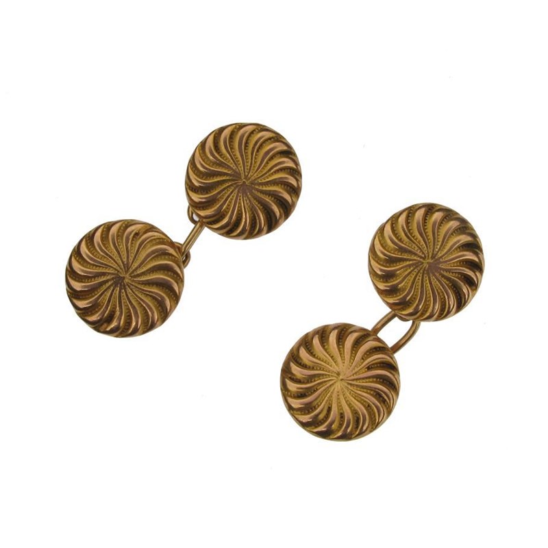 A pair of gold circular disc cuff links. Chased with swirl pattern.