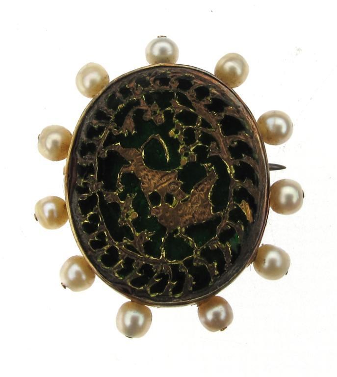A pertabghar brooch. The green enamel and gold mount depicting a hunting scene, with pearl surround and mounted in gold.