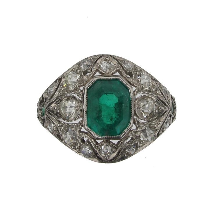 An emerald and diamond cluster ring. Centred with an emerald cut emerald and a pierced foliate mount set with small diamonds and two smaller emeralds in platinum. Size I.