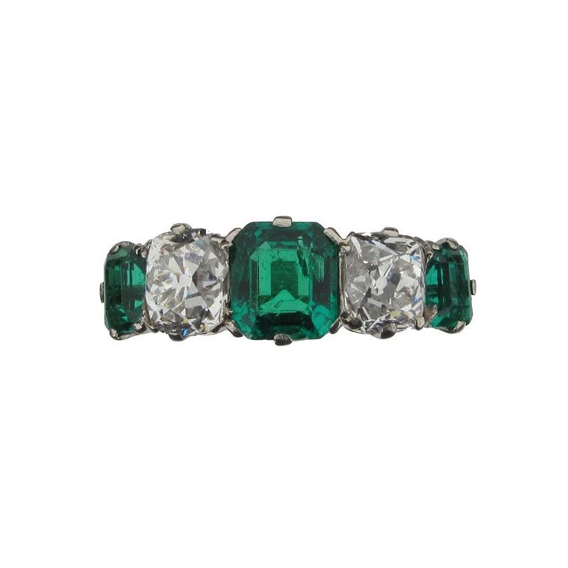 An Emerald and diamond five stone ring. The three graduated emerald cut emeralds are set with two cushion shaped diamonds in platinum. Size N.