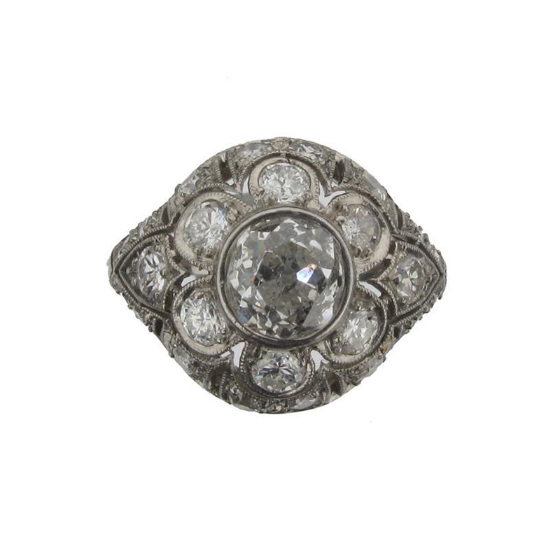 A diamond cluster ring. Centred with a transitional cut diamond with a diamond set pierced foliate platinum mount. French control marks. Size O.