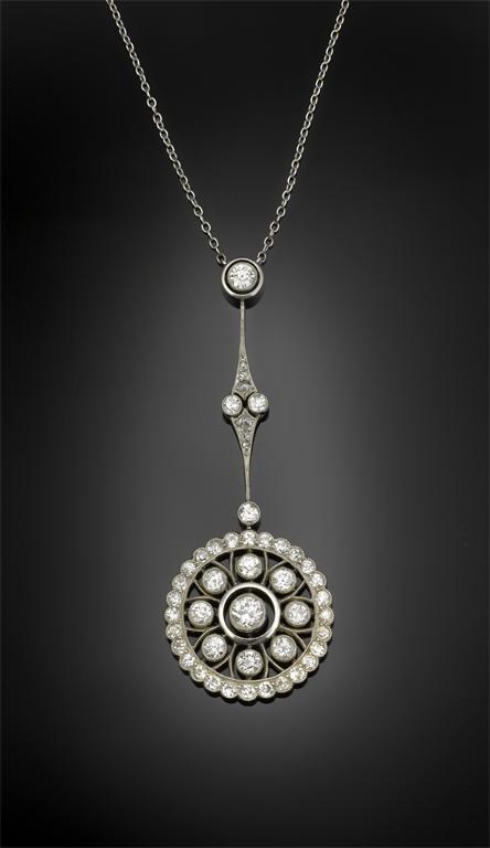 An Edwadian diamond set circular pendant. The centre circular cut diamond is set with two surrounds of smaller diamonds and suspends from a line of diamonds with a fine link platinum neck chain. Case.