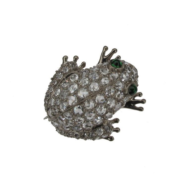 A diamond set frog brooch. Pave set with rose cut diamonds and greet garnet eyes in white gold. 1.7cm long.