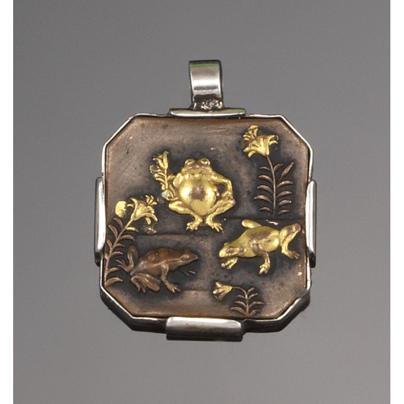 A silver mounted shakudo pendant, of octagonal form and decorated with frogs and foliage. 2cm wide.