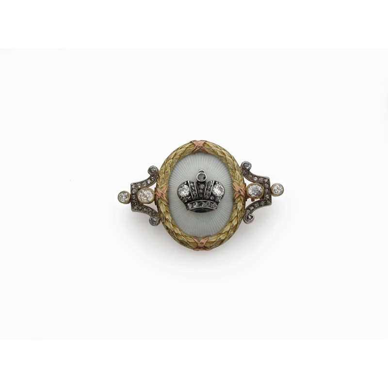 A Russian diamond set gold and enamel brooch, centred with a diamond set crown on oyster coloured guilloche enamel oval ground within a tied laurel two colour gold wreath. The shoulders millegrain set with graduated diamonds. Kokoshnick to rim. The pin with obscure mark, probably a Kokoshnik.