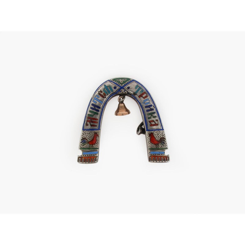 A Russian silver inverted U form brooch, with enamel cyrillic writing and two cockerels. The reverse stamped 84 zolotnik with Moscow mark and maker's initals. Missing pin. 3.5cm wide.