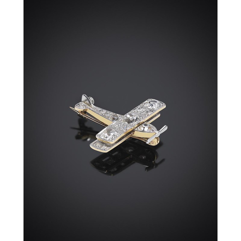 A diamond set brooch modelled as a biplane, C1930, milegrain set overall with graduated circular cut diamonds in silver and gold. 2.7cm long. Cased.
