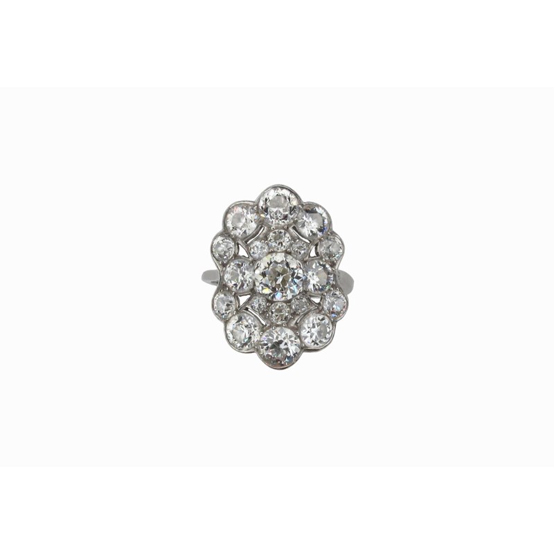 A diamond cluster ring, set with graduated circular cut diamonds in a pierced platinum mount. Size P.