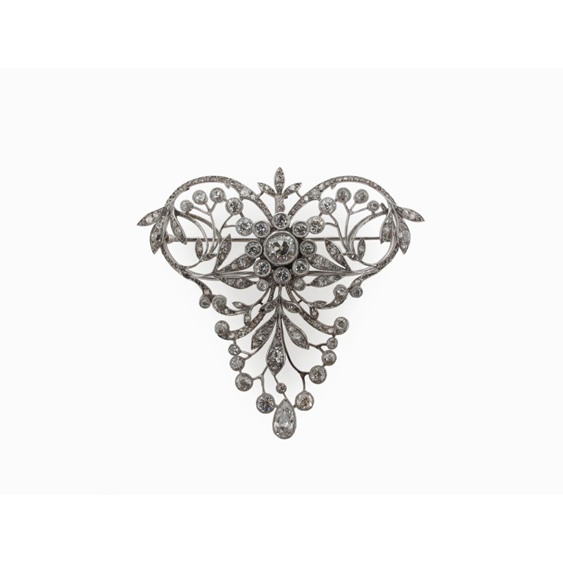 An Art Nouveau diamond brooch pendant, the central diamond weighs approximately 1.00cts, millegrain set overall with old circular cut and rose cut diamonds, and suspending a further pear shaped diamond, within scrolling foliate surround in platinum and white gold. With detactacble brooch fitting. 6.5cm wide. Case by Carrington & Co.