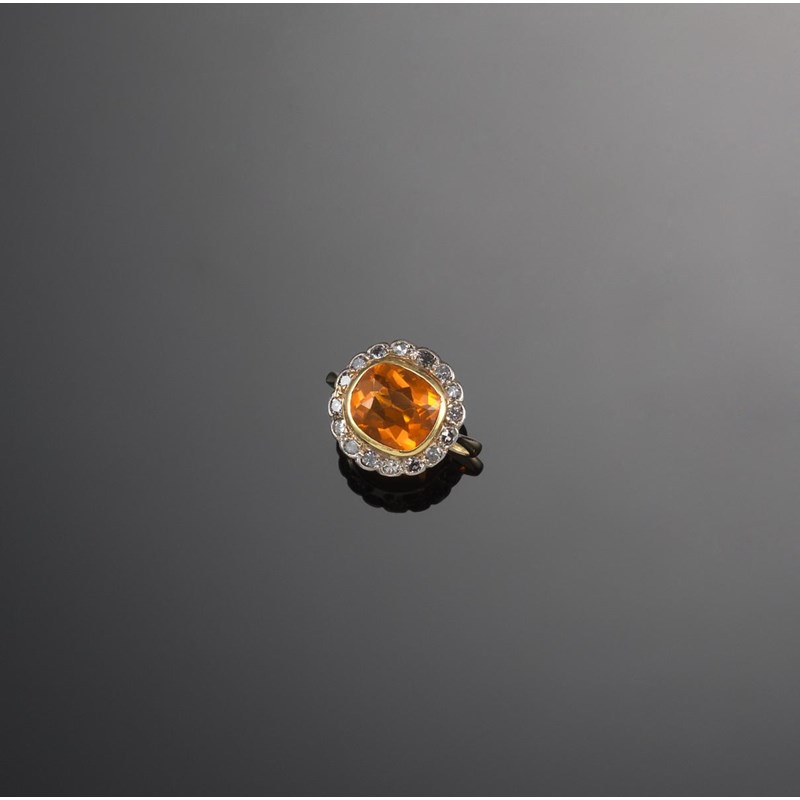 A fire opal and diamond cluster ring, the cushion shaped opal is set within a surround of circular cut diamonds in yellow gold and white gold. Size M.