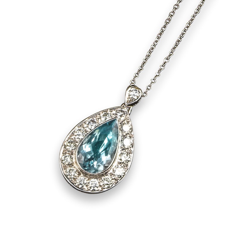 An aquamarine and diamond pendant, set with a pear-shaped aquamarine within a surround of circular-cut diamonds, suspending from a diamond-set bale, 2.5cm high, on a fine-link white gold neck chain, 40cm long