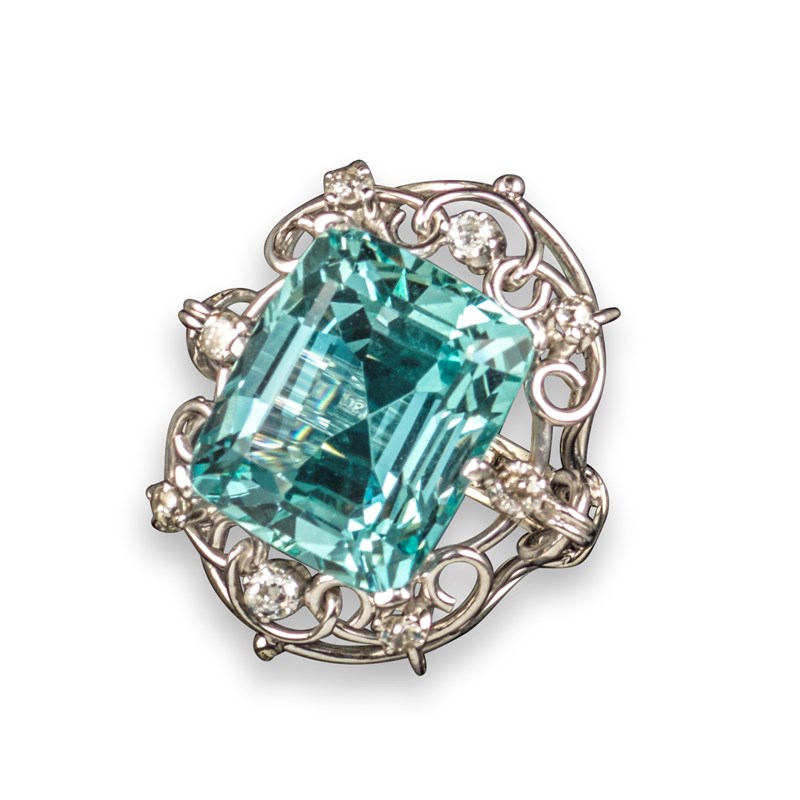 An aquamarine and diamond cluster ring, the emerald-cut aquamarine is set within a surround of old circular-cut diamonds in a wirework platinum and white gold mount, size M