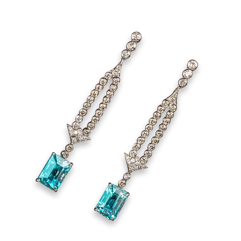 A pair of zircon and diamond drop earrings, the articulated birfurcated lines of round brilliant-cut diamonds suspend an emerald-cut zircon in platinum, post fittings, 5.3cm high