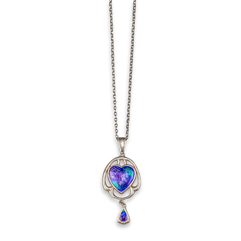A silver and enamel pendant by Charles Horner, centred with an enamel heart and suspending a silver and enamel drop, Chester hallmarks for 1923 and with maker's mark, on a fine-link silver neckchain, 48cm long