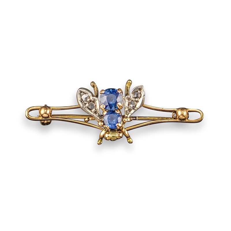 An Edwardian sapphire and diamond insect brooch, the stylised fly set with two graduated sapphires, the wings set with rose-cut diamonds in silver and gold, 4.3cm wide