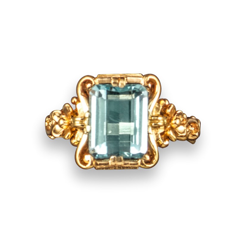 An aquamarine set ring, the rectangular step-cut aquamarine set within foliate scrolling yellow gold mount, size P