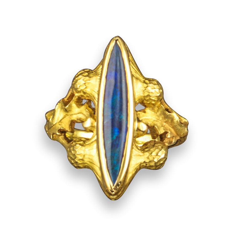 An early 20th century opal-set gold ring, the marquise-shaped black opal cabochon set within a foliate and thistle gold mount, French control mark and obscured maker's mark, size O