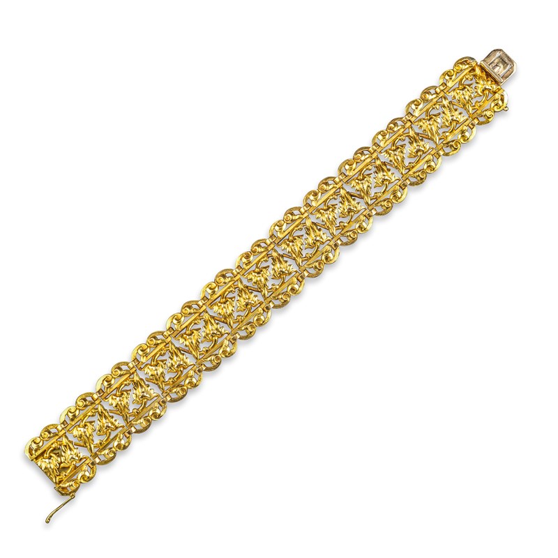 An Art Nouveau gold foliate bracelet, the quatrefoil links with central repoussé leaves in yellow gold, 17.5cm long