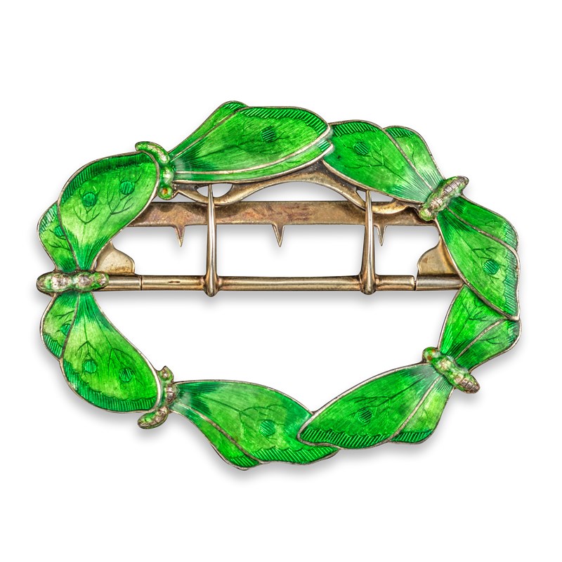A silver and enamel belt buckle by Child & Child, formed as interlocking butterflies decorated with green enamel in silver, signed to reverse with maker's mark and London hallmark for 1903, 8cm high