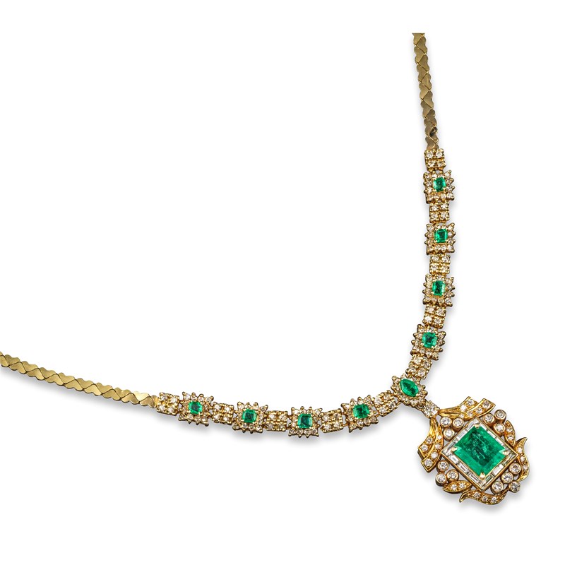 An emerald and diamond necklace, the necklace set with emerald and diamond clusters suspends a pendant set with an emerald-cut emerald within a border of baguette-shaped diamonds and scrolling yellow gold surround set with further diamonds, 46cm long