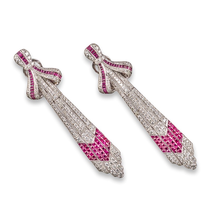 A pair of ruby and diamond drop earrings, the tied ribbon design millegrain set with graduated circular-cut diamonds and invisibly-set French-cut rubies in white gold, post and clip fittings, 7cm long