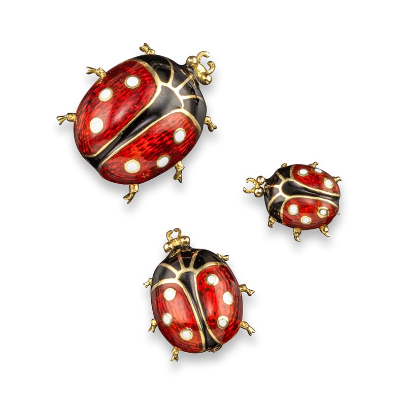 Three graduated ladybird brooches, decorated with polychrome guilloche enamel in yellow gold, 3.2cm, 2.5cm and 1.8cm long
