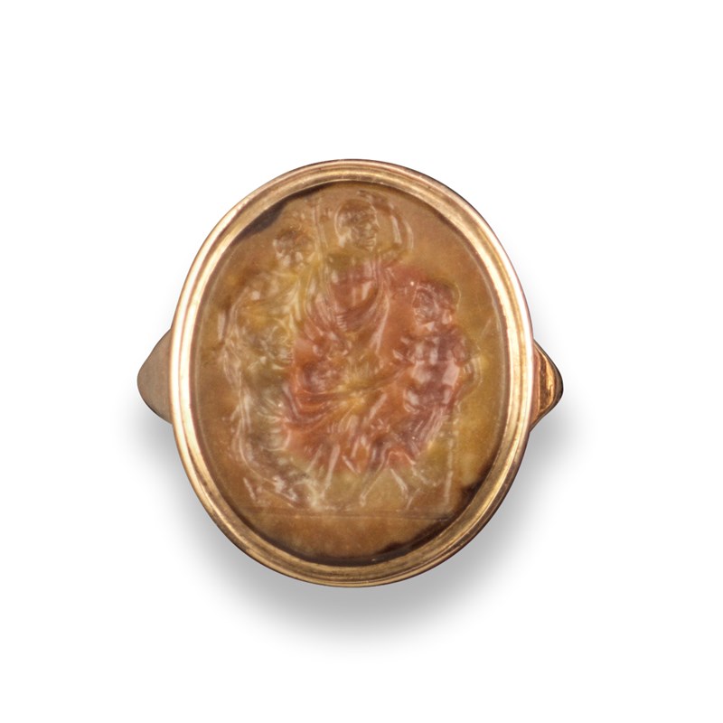 A Renaissance hardstone intaglio depicting Egyptians presenting the head of Pompey the Great to Julius Caesar, c16th-17th century, in a later gold ring mount, size R